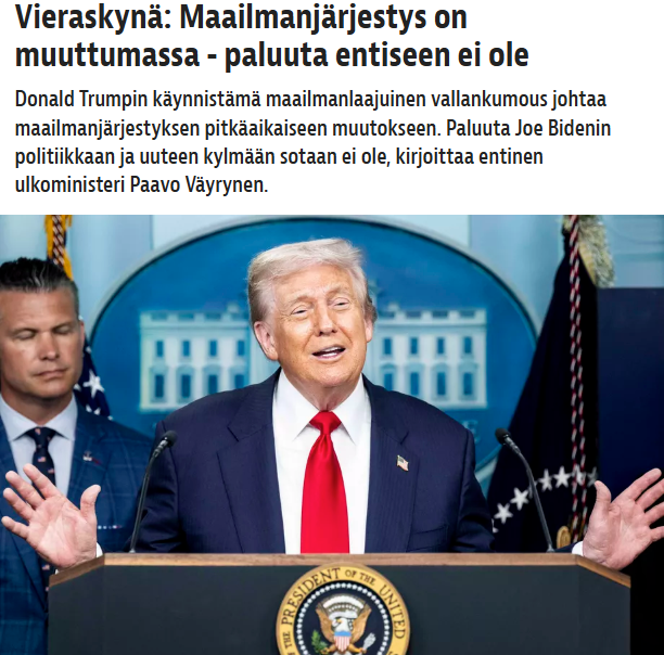 Donald Trumpin ulko- ja turvallisuuspolitiikkaa käsittelin Iltalehdessä 20.1.2026 julkaistussa Vieraskynä-kirjoituksessani ”Maailmanjärjestys on muuttumassa – paluuta entiseen ei ole”.
