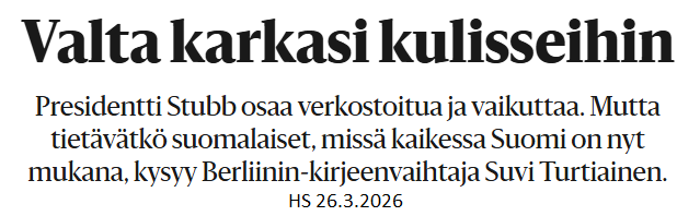 ”Presidentti Stubb osaa verkostoitua ja vaikuttaa, mutta suomalaiset eivät välttämättä tiedä, missä kaikessa Suomi on mukana. Epävirallinen vaikuttaminen korostuu ajassa, jossa perinteiset instituutiot ovat murroksessa. Kulisseissa vaikuttaminen voi olla ongelma demokratian näkökulmasta, jos kansan tai eduskunnan mahdollisuus vaikuttaa katoaa.